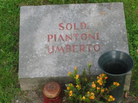 [Foto links: Der Italienische Militärinternierte Umberto Piantoni ist am 9.März 1944 im Erweiterten Krankenrevier Heidkaten (südwestlich von Kaltenkirchen) an "allgemeiner Schwäche" verstorben. (Foto: Hoch 1980); Foto rechts: Das Grab des Umberto Piantoni auf dem Friedhof Öjendorf (Privatarchiv Dressler)]