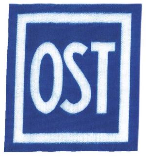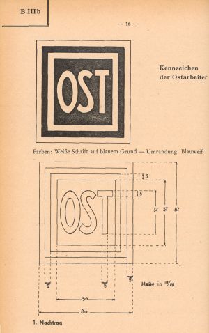 VIII "Die Arbeitskräfte aus dem altsowjetrussischen Gebiet haben während ihres Aufenthalts im Reich auf der rechten Brustseite eines jeden Kleidungstückes ein mit diesem fest verbundenes Kennzeichen stets sichtbar zu tragen. Das Kennzeichen besteht aus einem hochstehenden Rechteck von 70mm X 77 mm und zeigt bei 10 mm breiter blauweißer Umrandung auf blauem Grunde in weißer Schrift das Kennwort "Ost".