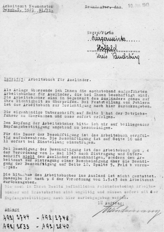 [Das Datum 10. Januar 1943 ist offensichtlich falsch. Gemeint ist wahrscheinlich das Jahr 1944.] Bürgermeister Reese wurde vom Arbeitsamt in Neumünster darüber informiert, dass die neuen Arbeitsbücher nach Hoffeld verschickt worden waren, und er erhielt genaue Anweisungen, wie jetzt vorgegangen werden sollte: "Die Arbeitsbücher sind in Gegenwart des Ausländers genau auf ihre Richtigkeit zu überprüfen. ... Die eigenhändige Unterschrift auf Seite 1 hat der Betriebsführer zu überwachen und muss sofort erfolgen."