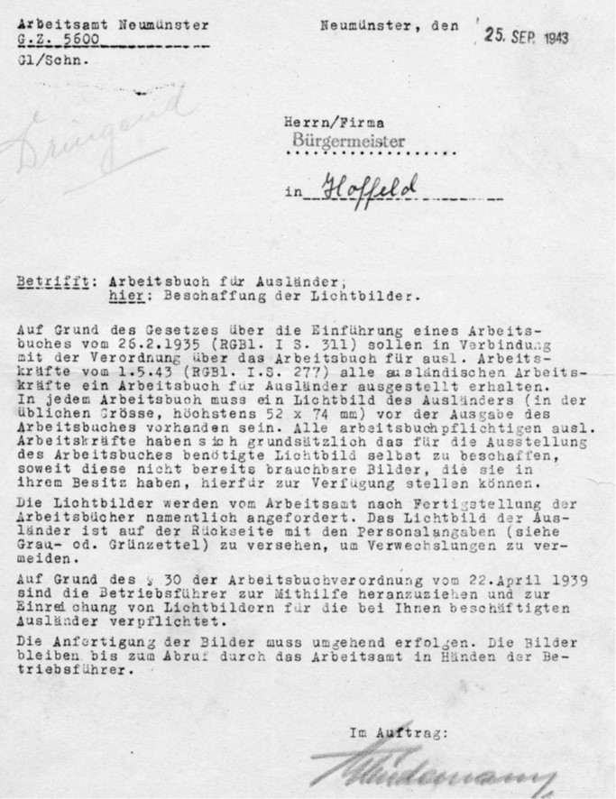 Die Einführung des Arbeitsbuches für Ausländer durch die Arbeitsämter 1943/44 Das Arbeitsamt Neumünster pflegt einen regen Schriftverkehr mit dem Bürgermeister von Hoffeld [1] Bürgermeister Reese aus Hoffeld (bei Bordesholm) wurde am 25. September 1943 vom Arbeitsamt in Neumünster angeschrieben: Es sollen "in Verbindung mit der VO über das Arbeitsbuch für ausländische Arbeitskräfte vom 1. Mai 1943 (RGBl. I, S.277) alle ausländischen Arbeitskräfte ein Arbeitsbuch für Ausländer ausgestellt erhalten."