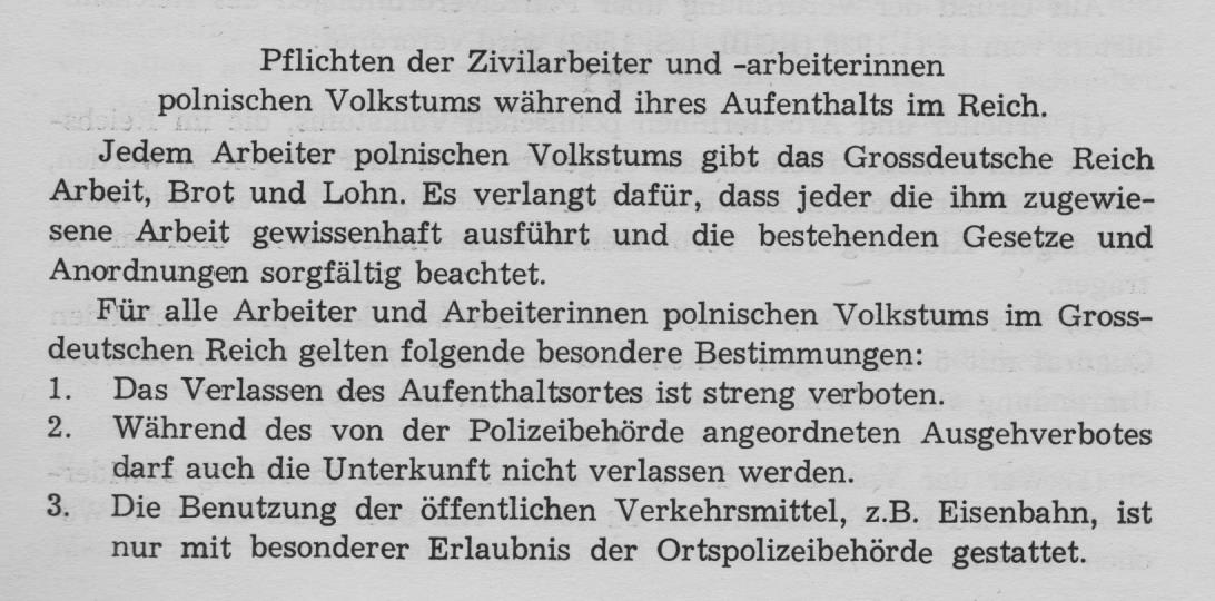 Bürgermeister Wilhelm Stabe hatte nicht nur das obige Meldeformular auszufüllen, er musste den Polen zusätzlich ein Merkblatt I verlesen oder zum Lesen in polnischer Sprache vorlegen, in dem sie eindringlich (nur) auf ihre Pflichten hingewiesen wurden. Dies geschah auch, damit sich bei späteren Strafverfahren kein Zwangsarbeiter auf "Unkenntnis" berufen konnte. Das Merkblatt durfte auf keinen Fall - weder an die Betreffenden noch an die deutschen Betriebsführer - ausgehändigt werden.[1] Die Behörden spürten offensichtlich, dass sie auf dem Wege waren, menschenunwürdige Bestimmungen durchzusetzen.