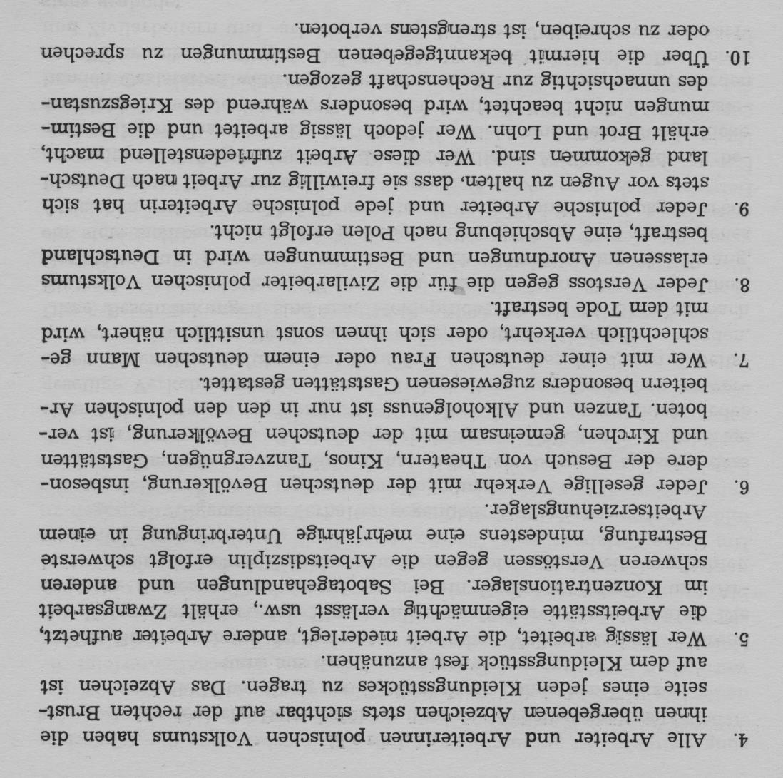 [1] Punkt 3 eines Schnellbriefes von Heinrich Himmler vom 08.03.1940 "Betrifft: Behandlung der im Reich eingesetzten Zivilarbeiter und -arbeiterinnen polnischen Volkstums", in: Documenta Occupationis X, hrsg. von Alfred Konieczny und Herbert Szurgacz, Poznan 1976, S.13 f.