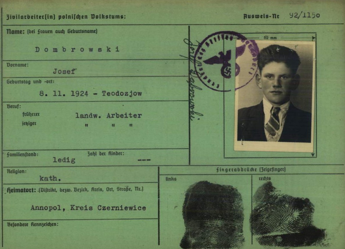 "Für die Arbeitskräfte polnischen Volkstums sind anstatt der bisher üblichen Ausländerkarteikarten (Vordruck R-Pol. 158) Karteikarten nach beigefügtem Muster anzulegen. Die Karteikarten sind mit Lichtbildern zu versehen. Das Doppel dieser Karteikarte ist an das Reichssicherheitshauptamt zu senden. Die Karteikarten sind beim Reichssicherheitshauptamt anzufordern."[3]