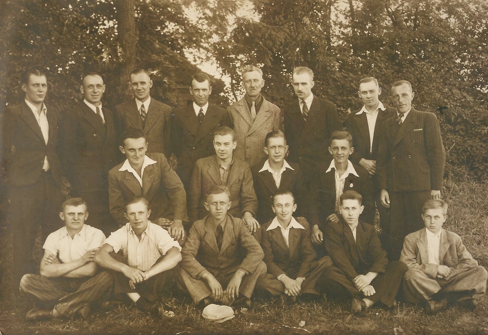 1940 auf dem Bordesholmer Friedhof. Hintere Reihe 4. von rechts: Vater Walkowiak. 1995 an gleicher Stelle während des von der Gemeinde Wattenbek finanzierten Besuchsprogramms.[Fotos: Archiv Fentsahm (Brügge) und Pressebüro Unterberg (Rendsburg)]
