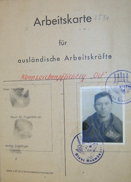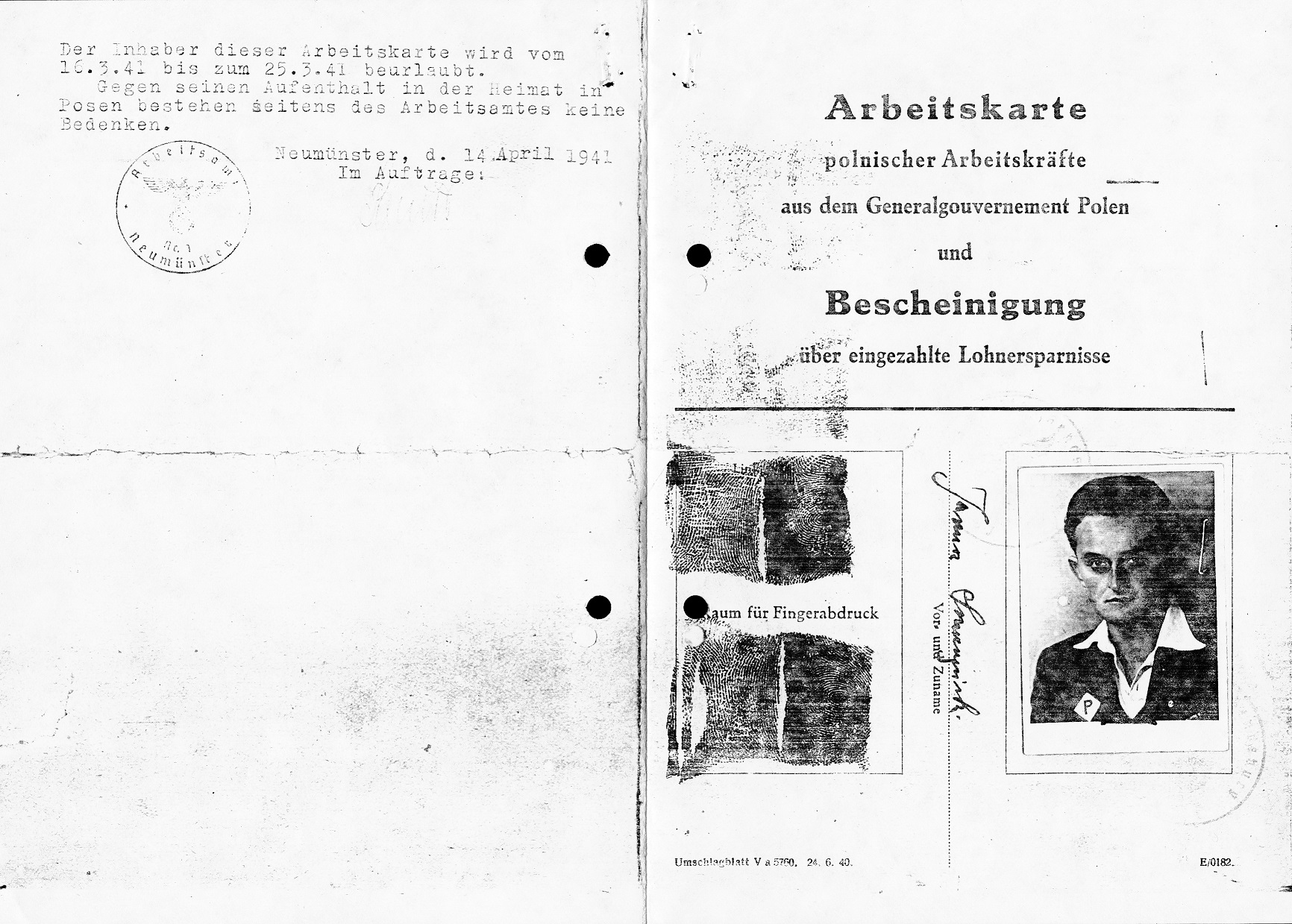 [Bild links: Stadtarchiv Neumünster, Akte 4683; Bild rechts: Archiv Fentsahm] Die Arbeitskarte wurde auch als Arbeitserlaubniskarte bezeichnet und sollte den Eintreffenden eigentlich „sofort nach dem Verlassen der Transportzüge” durch das zuständige Arbeitsamt ausgehändigt werden. Sie war ja aber noch nicht mit dem zugehörigen Passfoto versehen und deshalb war es verboten, sie in diesem Zustand an die Arbeitskraft zu übergeben.[3]