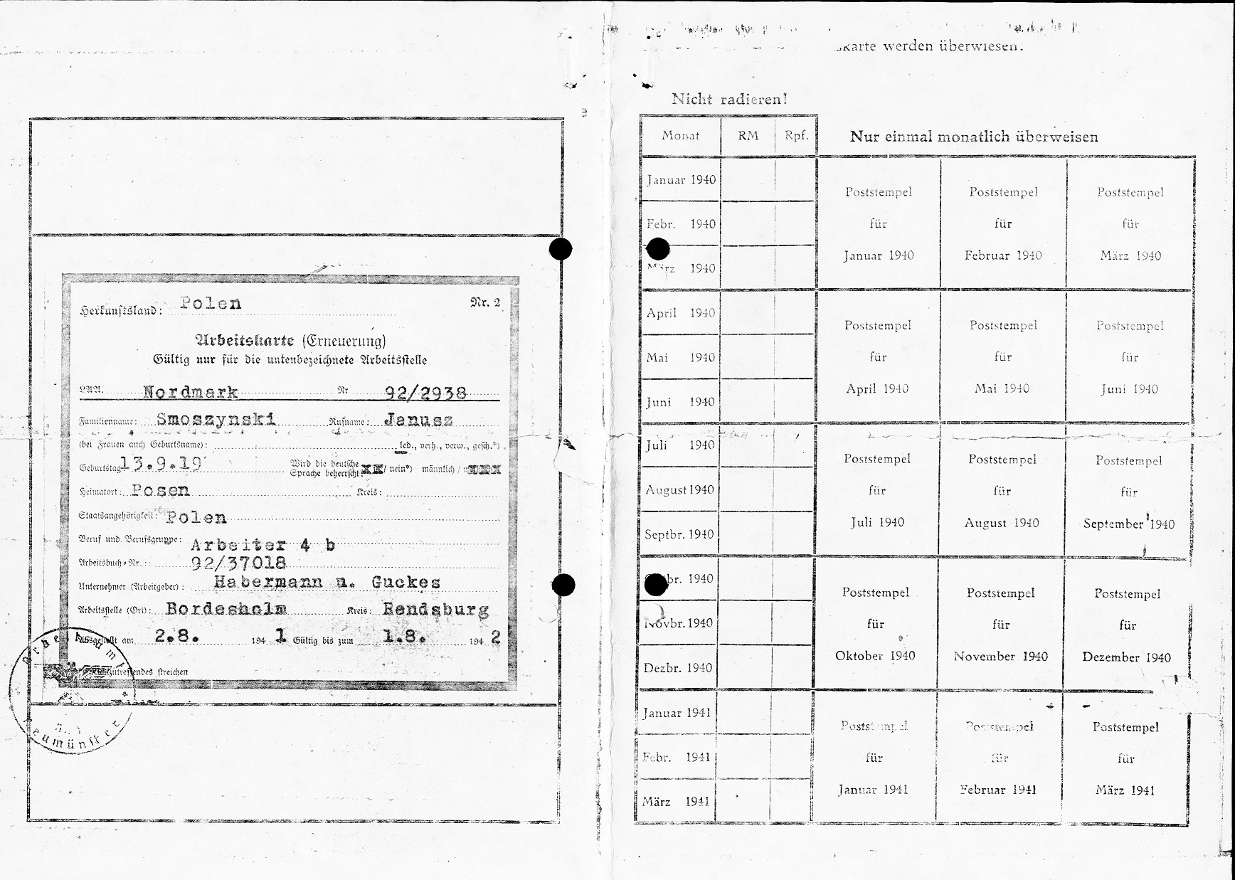 [Die Innenseite der Arbeitskarte von Janusz Smoczynski, ausgestellt am 2.8.1941, gültig bis zum 1.8.1942, in: Archiv Fentsahm] Als die Betroffenen dann endlich im Besitz ihrer Arbeitserlaubniskarte waren, mussten sie sich damit bei der Ortspolizeibehörde derjenigen Gemeinde melden, in der sie zum Arbeitseinsatz kommen sollten. In Bordesholm übte der Amtsvorsteher Buchholtz die Funktion als Ortspolizeibehörde aus. In der kleineren Gemeinde Wattenbek war Wilhelm Stabe als Bürgermeister der Ansprechpartner. Er war für die melderechtliche Erfassung der ausländischen zivilen Arbeitskräfte zuständig, da Wattenbek eine Gemeinde ohne eigene Ortspolizeibehörde war.
