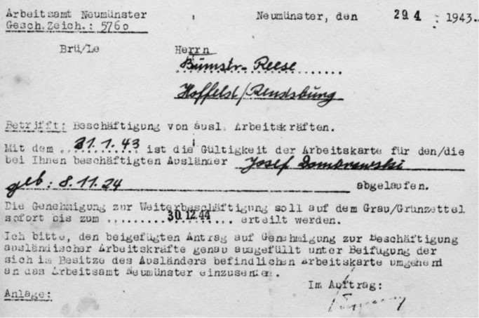 [Schreiben des Arbeitsamtes Neumünster an den Bürgermeister von Hoffeld (bei Bordesholm) vom 29. April 1943, in: Archiv der Heimatsammlung Bordesholm] Bürgermeister Reese aus Hoffeld wurde darauf hingewiesen, dass die Gültigkeit der Arbeitskarte für den in Hoffeld beschäftigten Polen Josef Dombrowski am 21. Januar 1943 abgelaufen sei. Die Genehmigung zur Weiterbeschäftigung durch das Arbeitsamt Neumünster "soll auf dem Grau/Grünzettel sofort bis zum 30.12.44 erteilt werden."